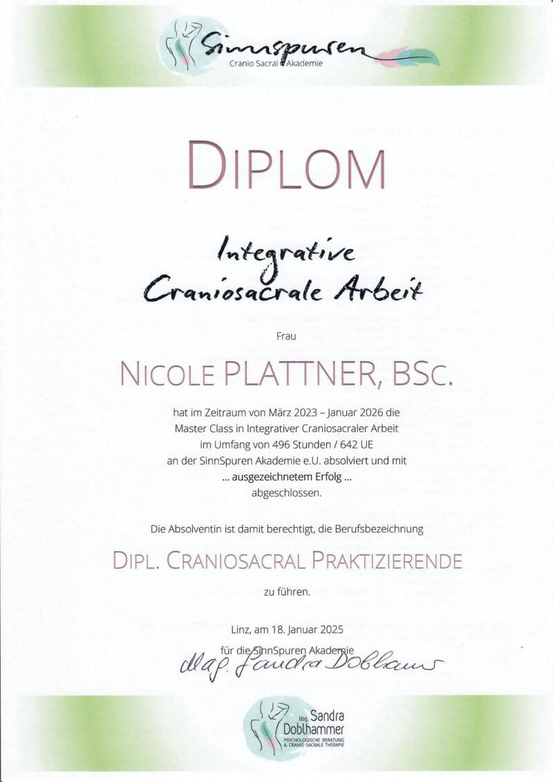 Ich habe meine Grundausbildung in Craniosacraler Körperarbeit an der Vitalakademie abgeschlossen und anschließend eine 2‑jährige Masterclass an der SinnSpuren Akademie absolviert. So habe ich erfolgreich den dreijährigen Diplomlehrgang zum Dipl. Craniosacral Practitioner abgeschlossen.